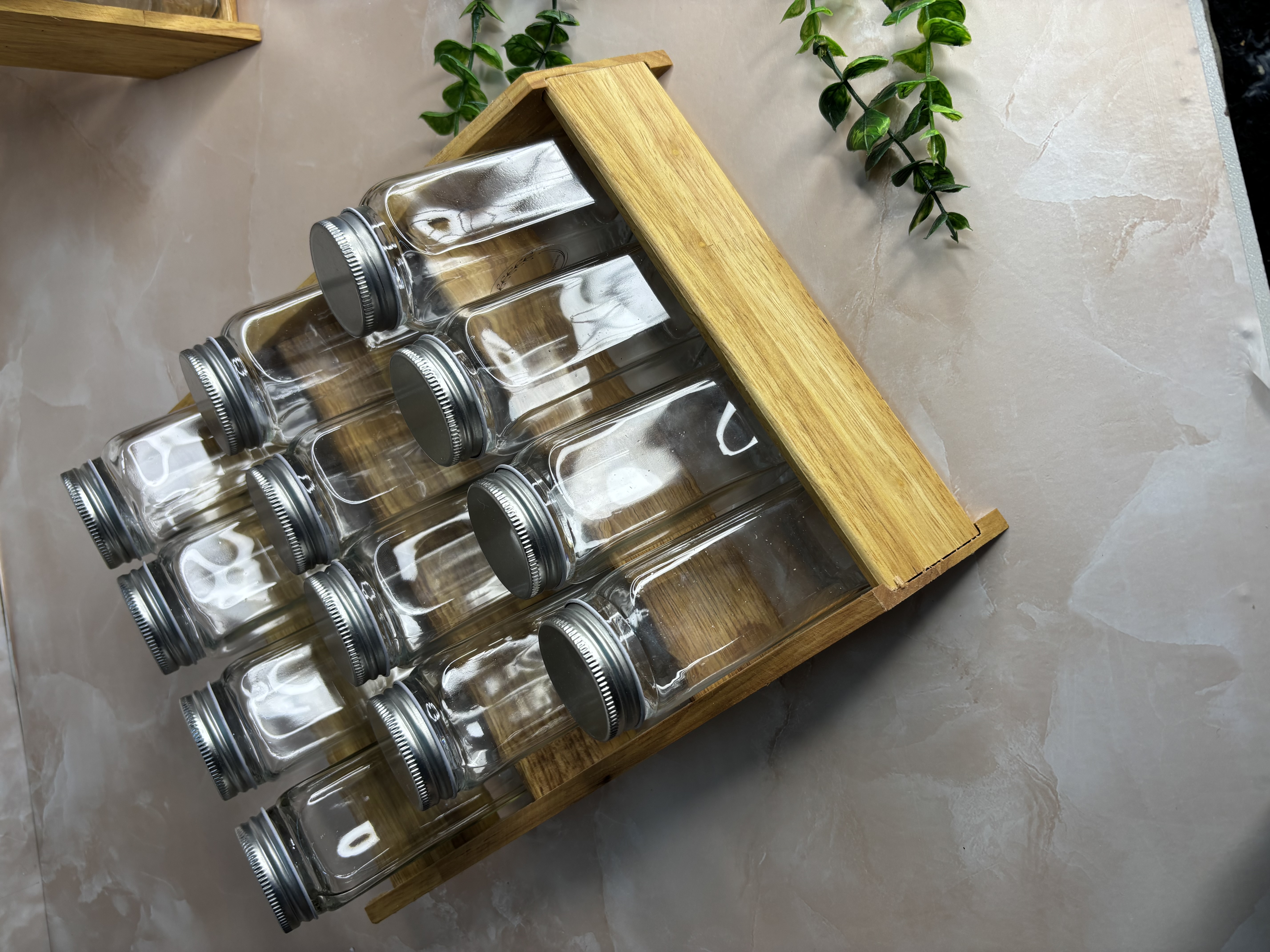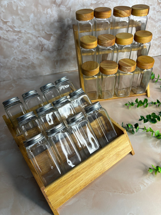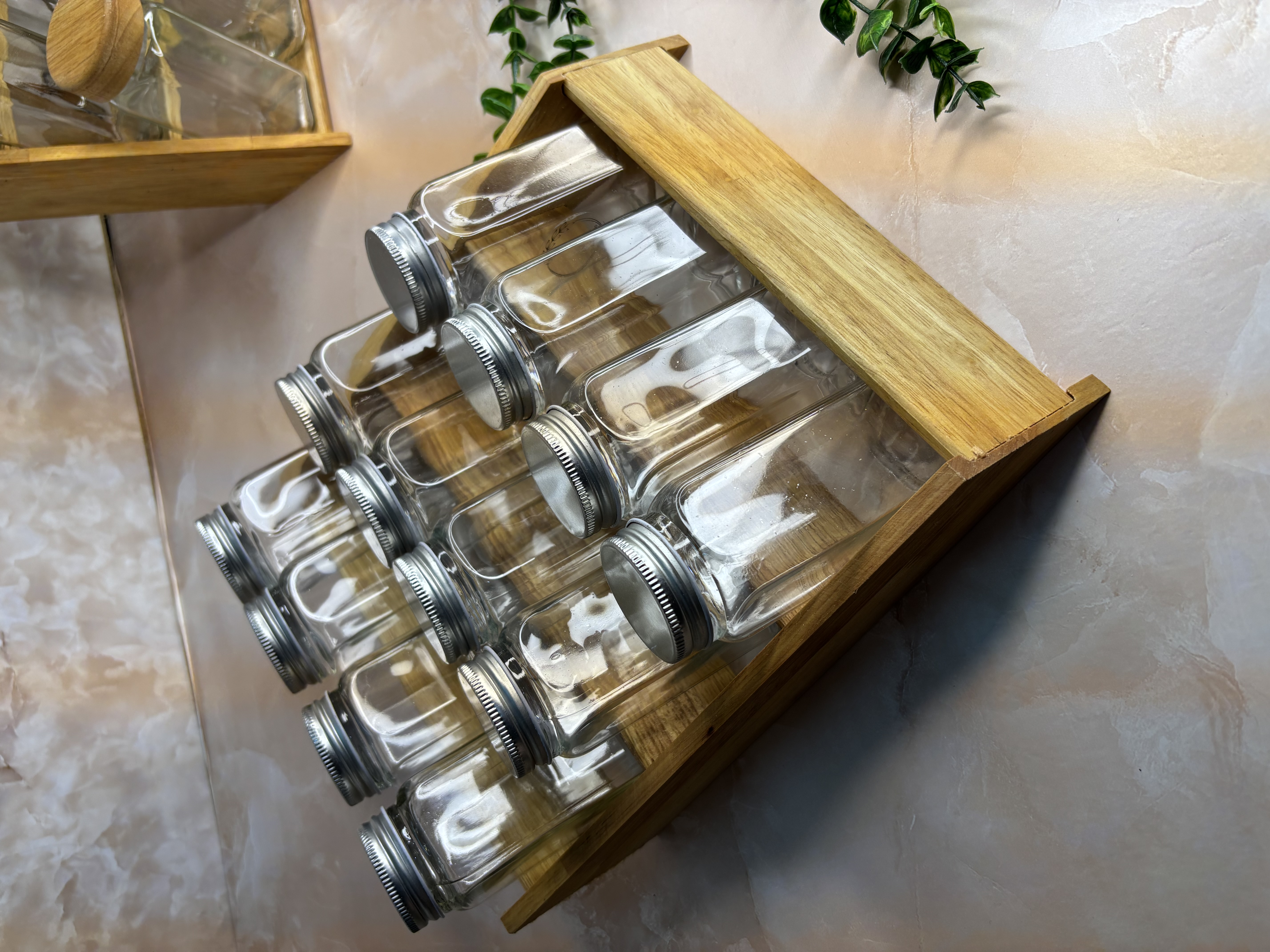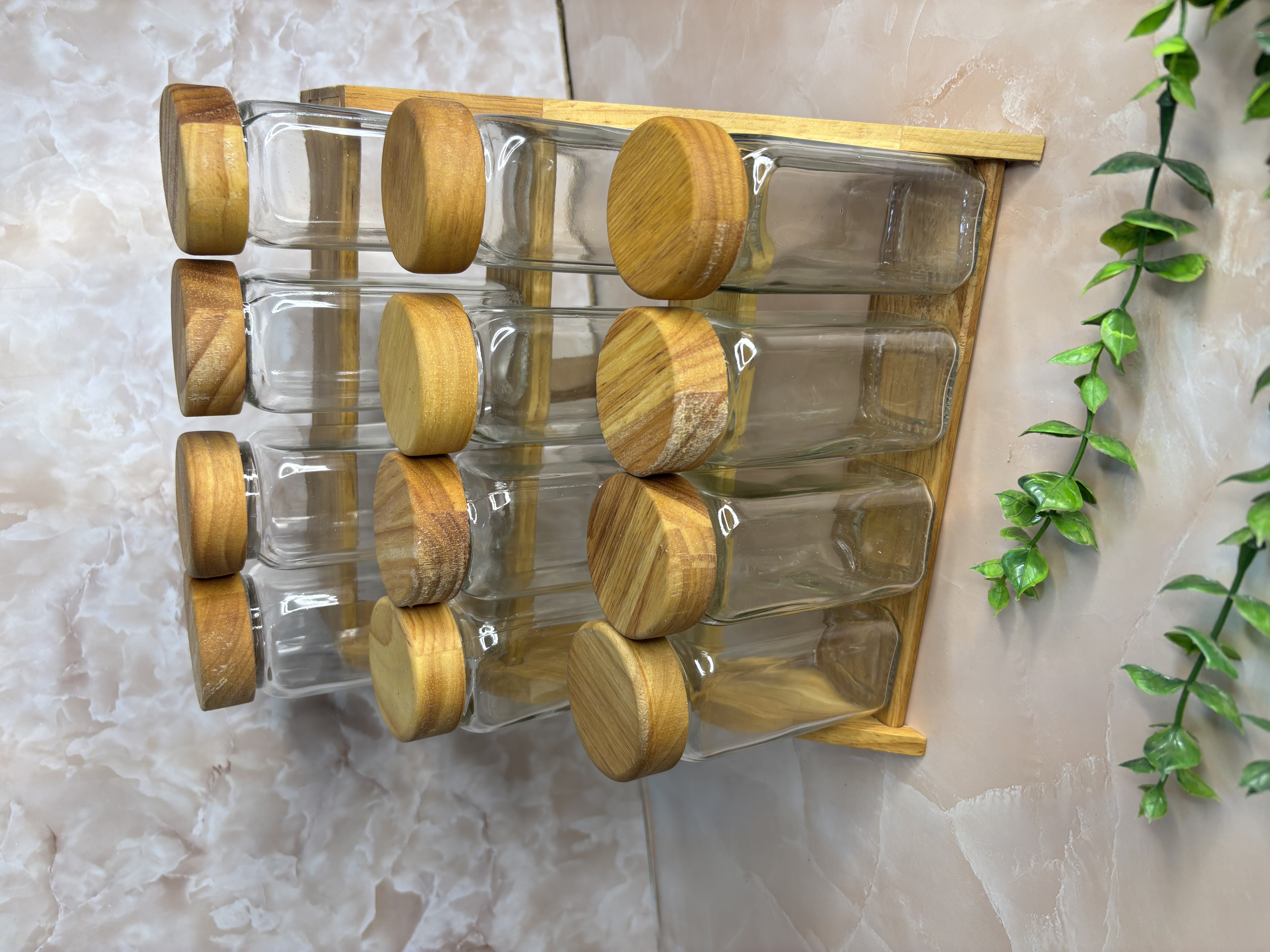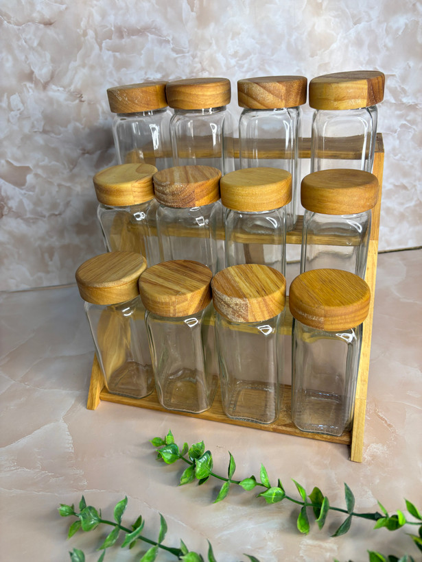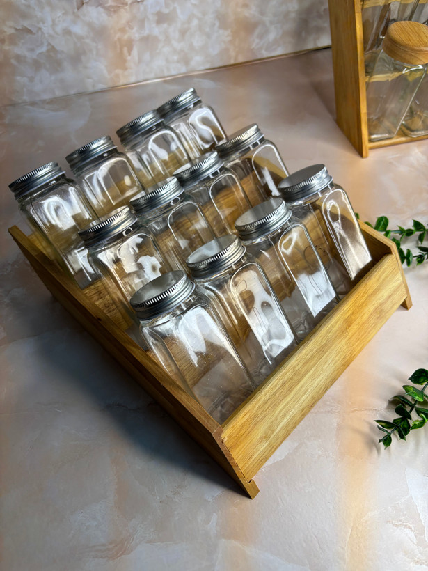 پک ۱۲تایی شیشه ادویه با طراحی شیک و کاربردی، شامل ۱۲ عدد شیشه مککارتی با درب چوبی، ۱۲ عدد لیبل، ۱۲ سری نمکپاش و یک استند چوبی دوحالته از جنس مرغوب رابروود است.